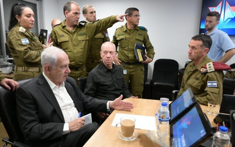 Premiér Benjamin Netanjahu (L) se 8. října 2023 sejde s ministrem obrany Yoavem Gallantem (C) a vojenskými náčelníky v velitelství IDF v Tel Avivu za účelem posouzení bezpečnosti. (GPO)