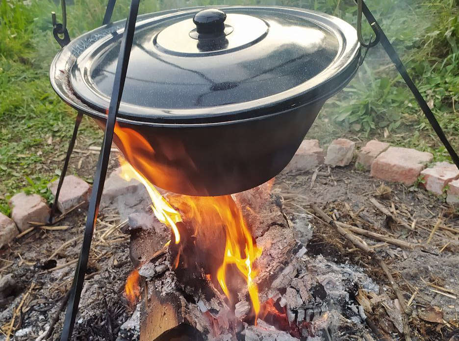 Na to, aby se ale mohl dělat kotlíkový guláš na ohni, ten oheň někdo musí připravit. A to padlo na chlapy. Manžel vzal syna, aby společně nachystali oheň a trojnošku s kotlíkem. Na mě a dceru zůstala příprava jídla. Recept naleznete zde – Kotlíkový guláš.