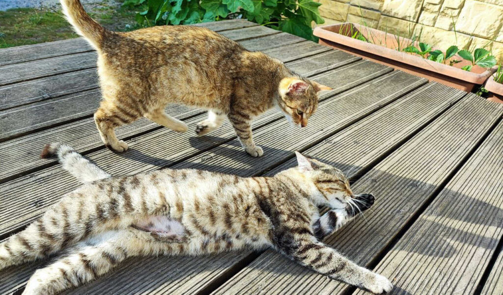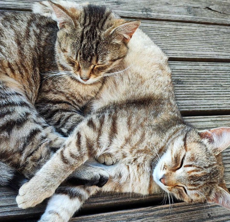 Pan doktor udělal takové malé stehy a jizvičky se nám pěkně hojí. Při předání mi hlásil, že už si holky zašpásovaly a jako drzého viníka jsem si přestavila Čičina. Tomu jsem dala na výběr už na jaře, kulky nebo zima. A podle úprku z našeho domu jsem usoudila, že vyhrály kulky. Kočky napřed spinkaly a musela jsem je nechat až do večera v přepravce, ale jakmile jsem za nimi odpoledne přišla, už vypadaly, že by si něco daly. Tak jsem jim dala vodu… Tu nepily. Opravdu čekaly na něco dobrého. Měly štěstí, protože jsem jim koupila kapsičky, na přilepšenou, za ten stres a cestování. Tak si je tak rychle zblajzly, že by si člověk myslel, že nežraly 3 dny. Ale tak to u koček asi je. Do večera jsem je měla pro jistotu zavřené, aby si ještě poležely, pospinkaly… neboť mě pan doktor varoval, že by odněkud třeba mohly spadnout. Suché jsem jim taky dávat neměla, aby se třeba nezadávily. Oholené bříška vypadají ještě dnes, po týdnu vtipně a tak jsem vám je vyfotila, že jsou v pořádku a užívají si sluníčka. Druhý den už děvčata lítaly jak kulové blesky po zahradě a Kulička mě i dnes potěšila, když jsem jí viděla, že si nese v tlamě malou myšku. Rozhodilo mě, že pořád nebyla mrtvá, to mi vadí, ale chválila jsem jí, že loví. To se o Tygřici říci nedá. A Čičin mi taky poslední dobou přišel jen jako povaleč. Tak nevím nevím… Doufám, že s přívalem myší z pole jak začne sezóna, bude každá packa dobrá.